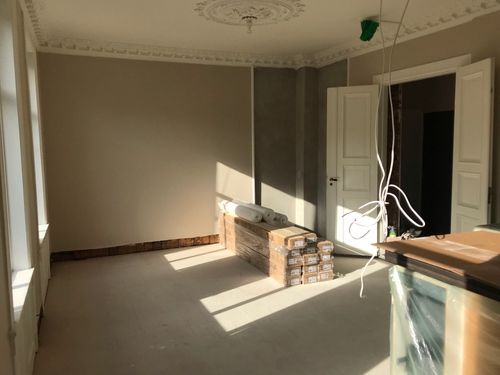 Due to the uneven and worn original flooring, all floors were removed and replaced with level, insulated flooring. Given the building's age, we also took comprehensive measures to insulate the structure, thereby minimizing noise between floors. The kitchen design was developed in collaboration with Strai Kitchen, a local producer in Stavanger, Norway.